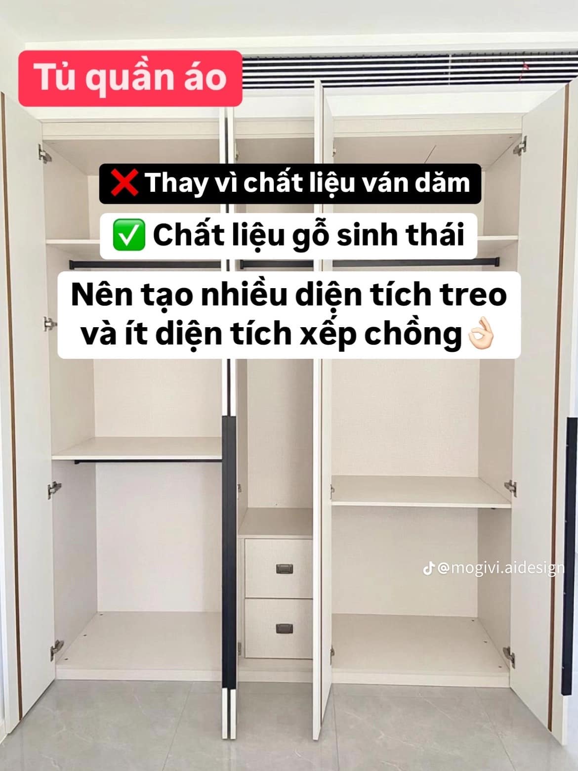 Với tủ quần áo, không nên chọn ván nhiều lớp vì có thể dễ bị cong vênh theo thời gian và trong quá trình sử dụng. Thay vào đó, bạn nên chọn ván gỗ thông châu Âu với độ bền cao hơn và vẻ ngoài sang trọng. Khi thiết kế tủ quần áo, nên ưu tiên tay nắm tối giản hoặc tay nắm nhúng vô hình để tạo cảm giác thanh lịch và tiết kiệm không gian.