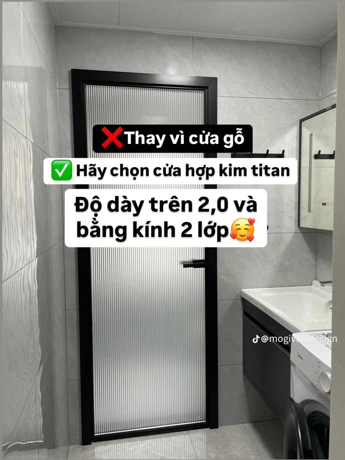 Cửa phòng tắm nên tránh sử dụng cửa gỗ vì dễ bị ẩm mốc và hư hỏng do nước. Thay vào đó, bạn nên chọn cửa hợp kim titan. Loại cửa này không chỉ bền hơn mà còn có khả năng chống gỉ, chịu được môi trường ẩm ướt tốt hơn. Độ dày cửa trên 2.0 mm và được làm bằng kính 2 lớp sẽ giúp tăng cường sự riêng tư và an toàn khi sử dụng.