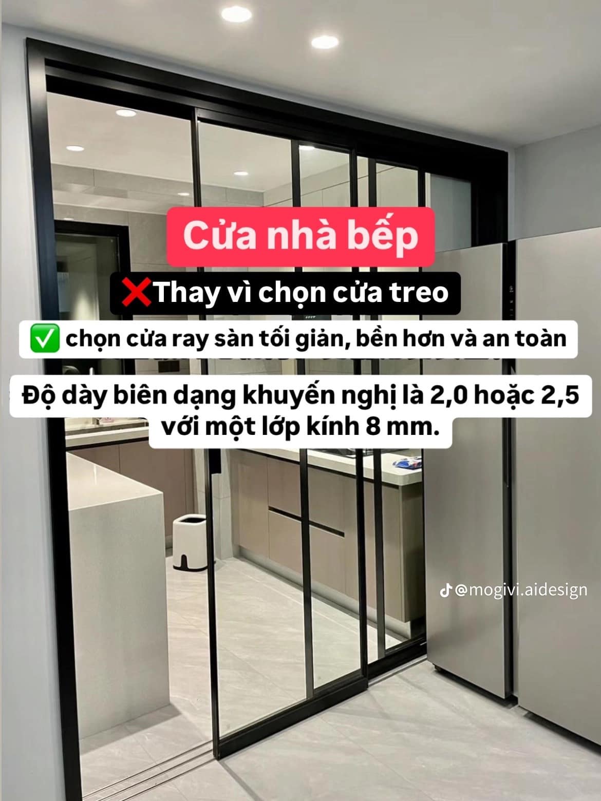 Thay vì chọn cửa treo, bạn nên chọn cửa ray sàn tối giản, vì tính bền vững và an toàn của nó cao hơn so với cửa treo. Khi lựa chọn cửa bếp, độ dày biên dạng lý tưởng là 2.0 hoặc 2.5 mm với một lớp kính 8 mm. Điều này đảm bảo rằng cửa bếp không chỉ bền mà còn dễ vệ sinh, chống va đập và chịu được nhiệt độ cao trong môi trường nhà bếp.
