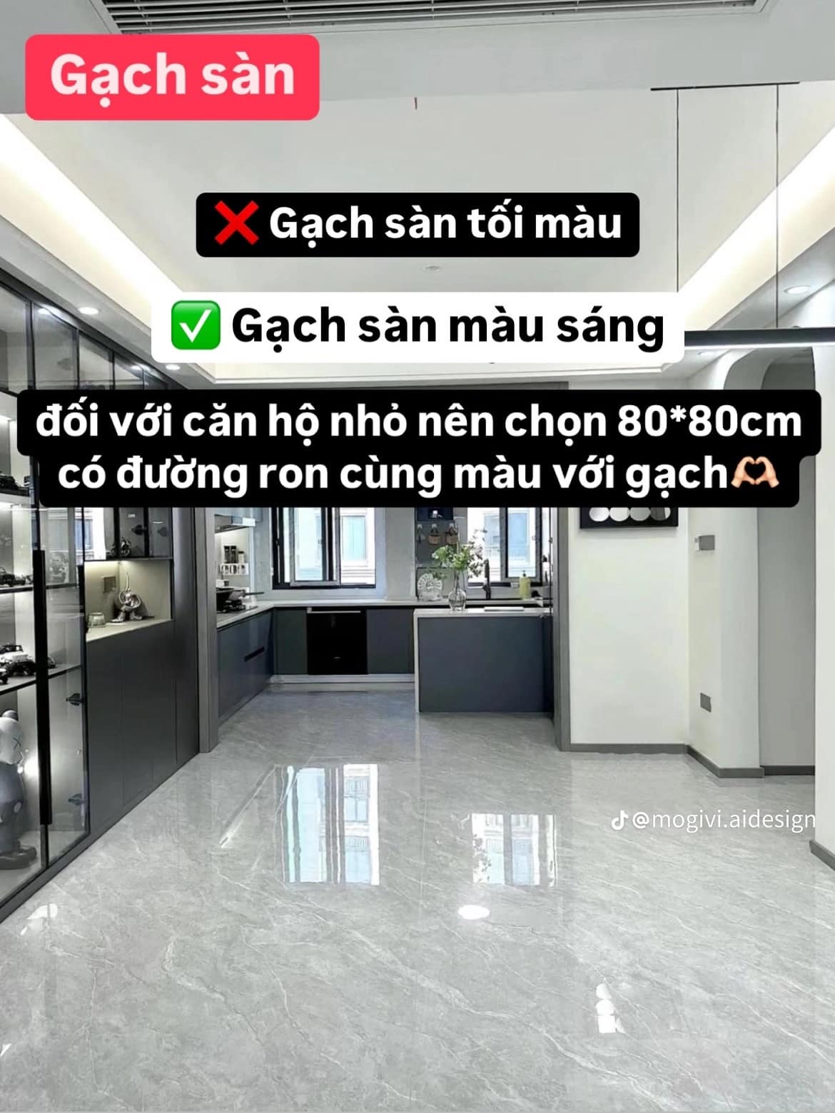 Khi chọn gạch lát sàn, tránh sử dụng gạch sàn tối màu vì sẽ làm cho không gian trở nên chật chội và khó vệ sinh. Thay vào đó, nên chọn gạch sàn màu sáng để tạo cảm giác rộng rãi, sạch sẽ hơn cho căn hộ. Đối với những căn hộ nhỏ, lựa chọn kích thước gạch 80×80 cm cùng đường ron cùng màu với gạch sẽ giúp không gian trở nên hài hòa và đẹp mắt.