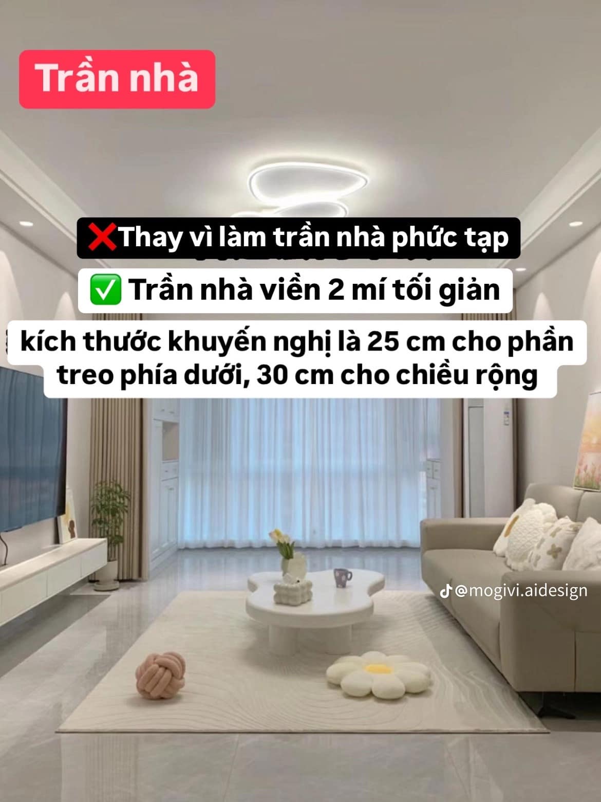 Thay vì làm trần nhà phức tạp và rườm rà, hãy chọn trần viền 2 mí tối giản. Thiết kế này không chỉ giúp căn phòng trông thanh thoát hơn mà còn tạo cảm giác thoáng đãng, rộng rãi. Trần nhà quá nhiều chi tiết có thể làm cho không gian bị “nặng nề”, trong khi trần tối giản lại mang đến sự tinh tế và hiện đại.